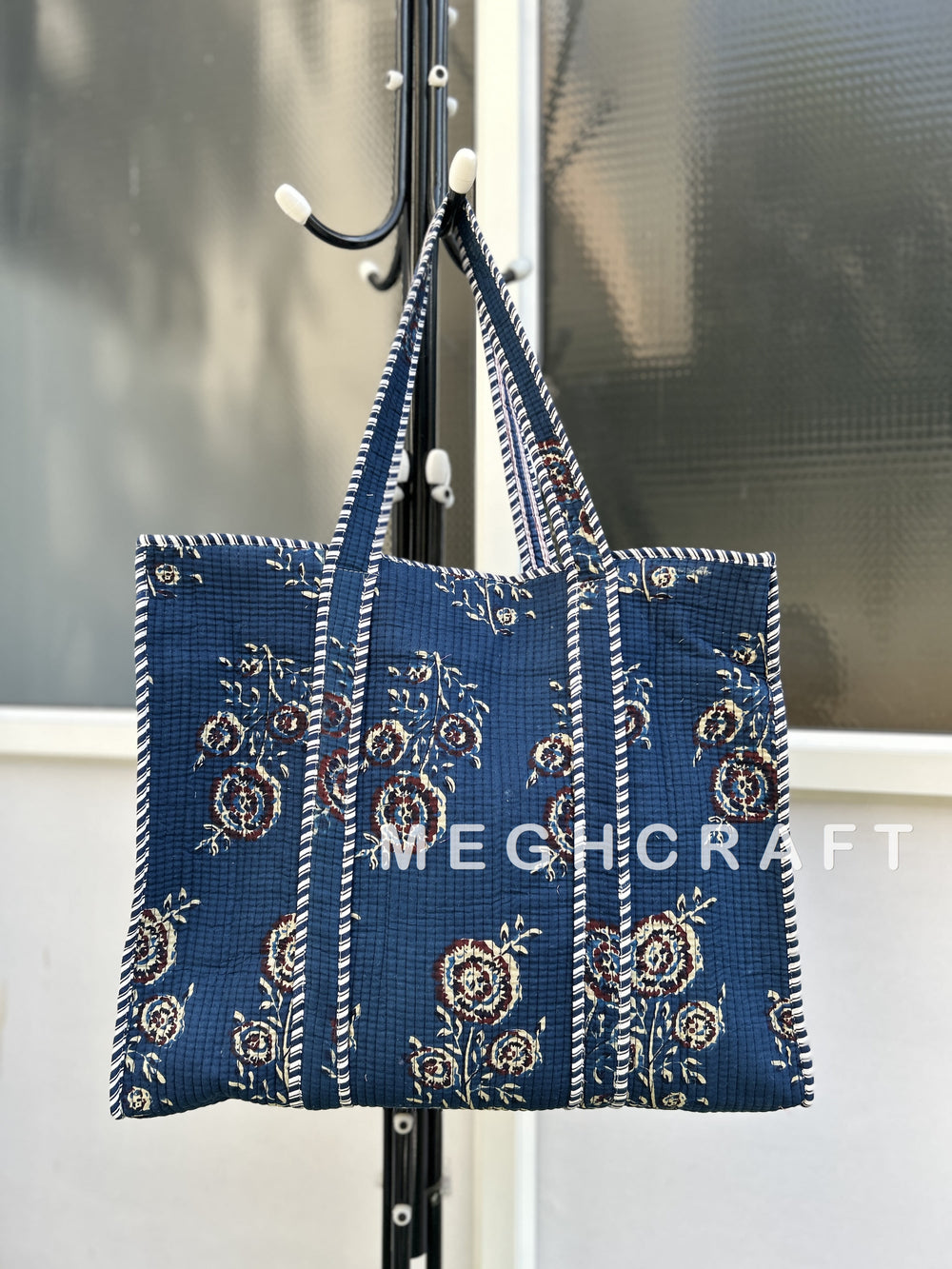 Our quilted totes are handmade by Indian artisans, so there may be some irregularities, and the print placement may vary by bag.