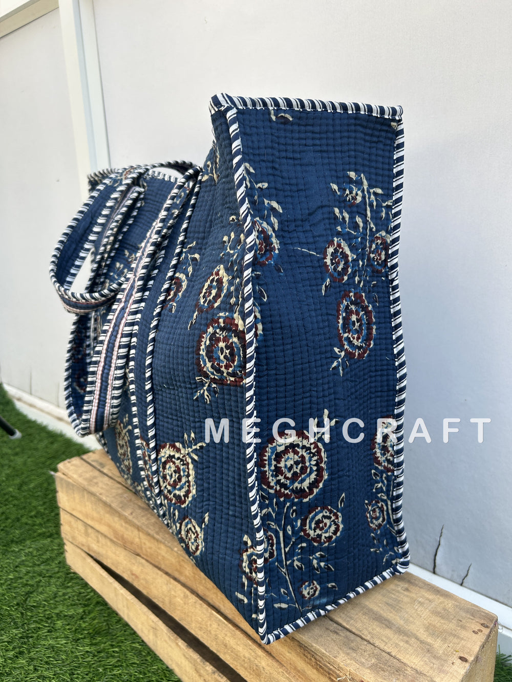 Perfect for a market tote, beach bag, weekender Bag, Shopping bags and much more! Handcrafted Indian cotton block-printed quilted tote bag with Zip closure, perfect for shopping, travel, or daily use. Features traditional patterns, durable and comfortable shoulder straps. Indian cotton, block print, quilted tote bag, shopping bag, shoulder bag, handcrafted, eco-friendly, traditional patterns, lightweight, spacious, reusable, artisanal, fair trade, sustainable.