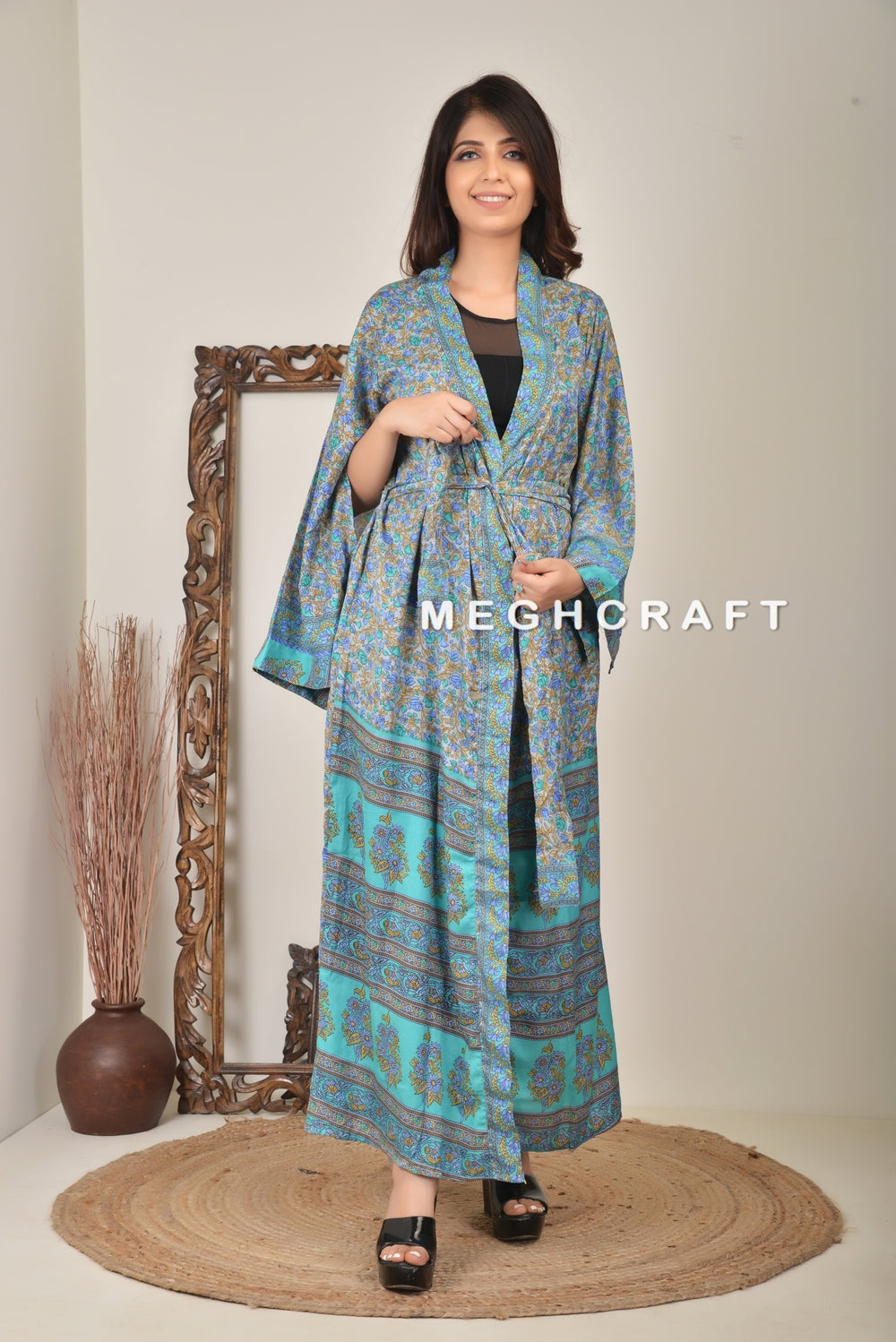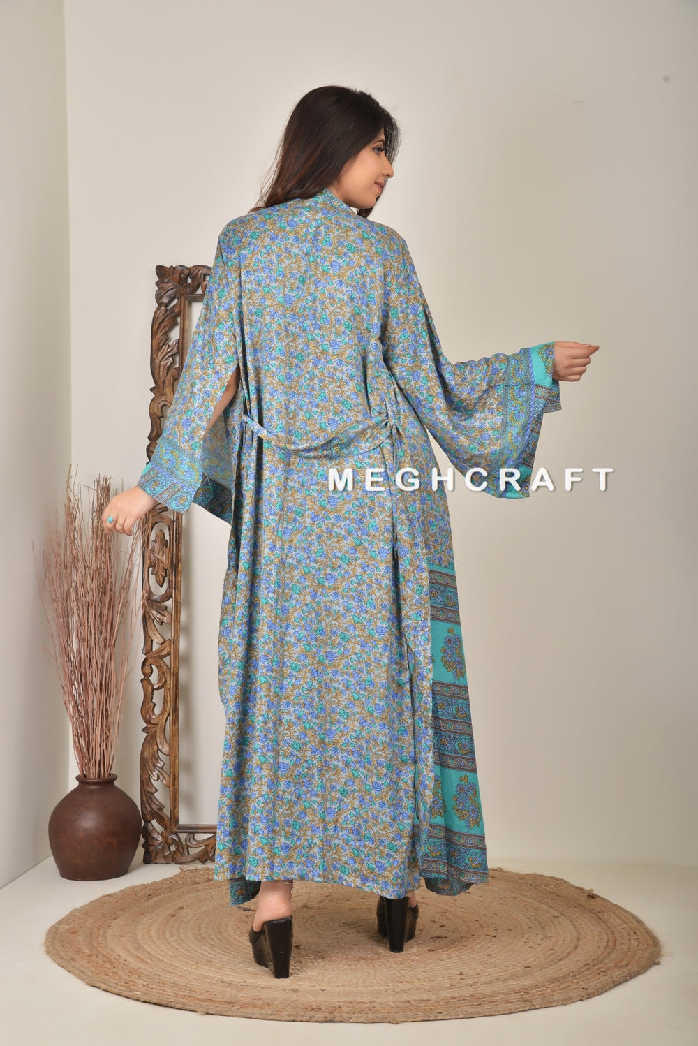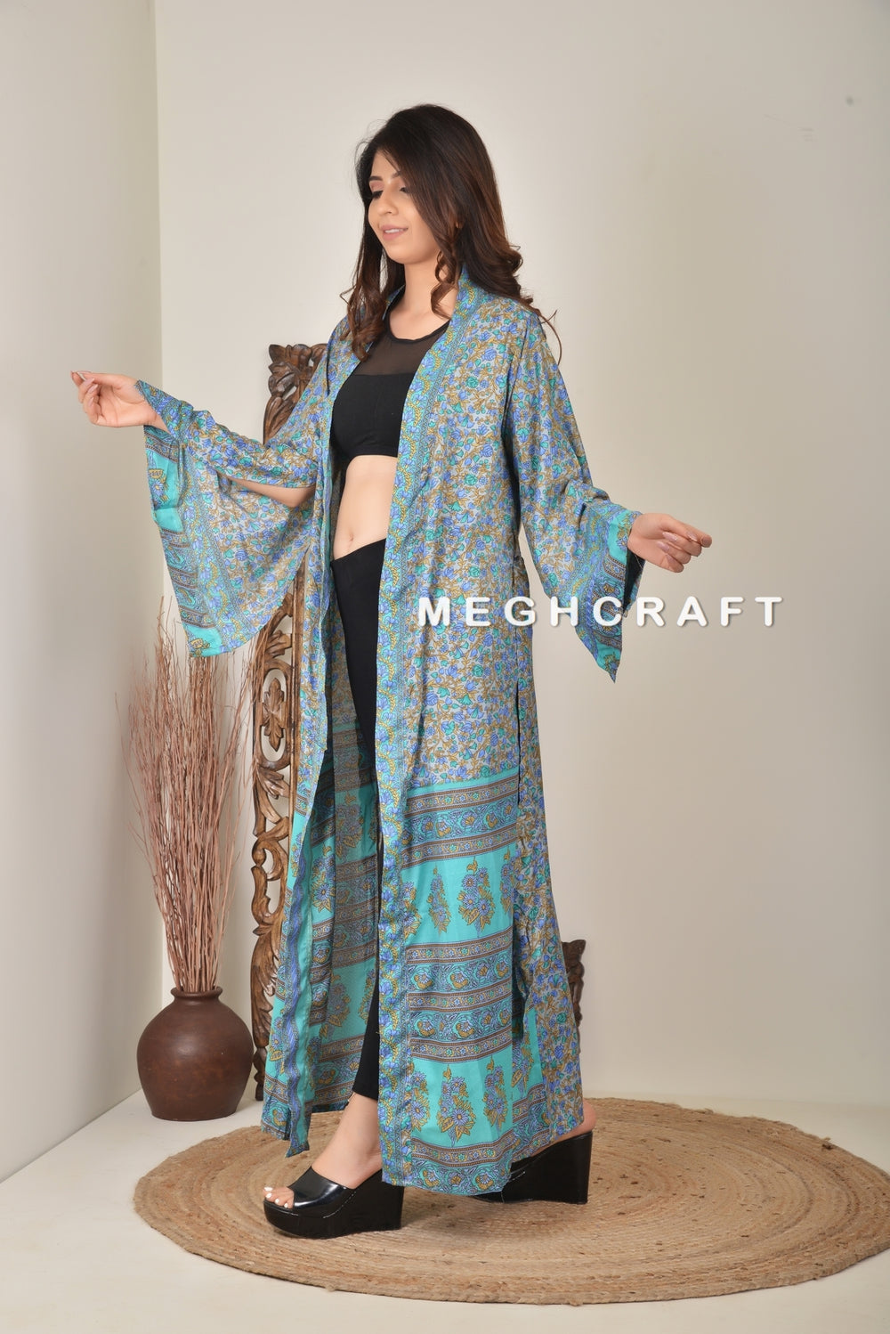 Designer Bohemian Floral Beach Wear Silk Kimono Robe with Belt / Body Cover-up . Long ,Loose Fit, Soft & Comfy. Best suitable as Beach wear, Bikini Cover up, Swimsuit, Bathrobe, Summer Cardigan, Sleepwear & Resort wear.
