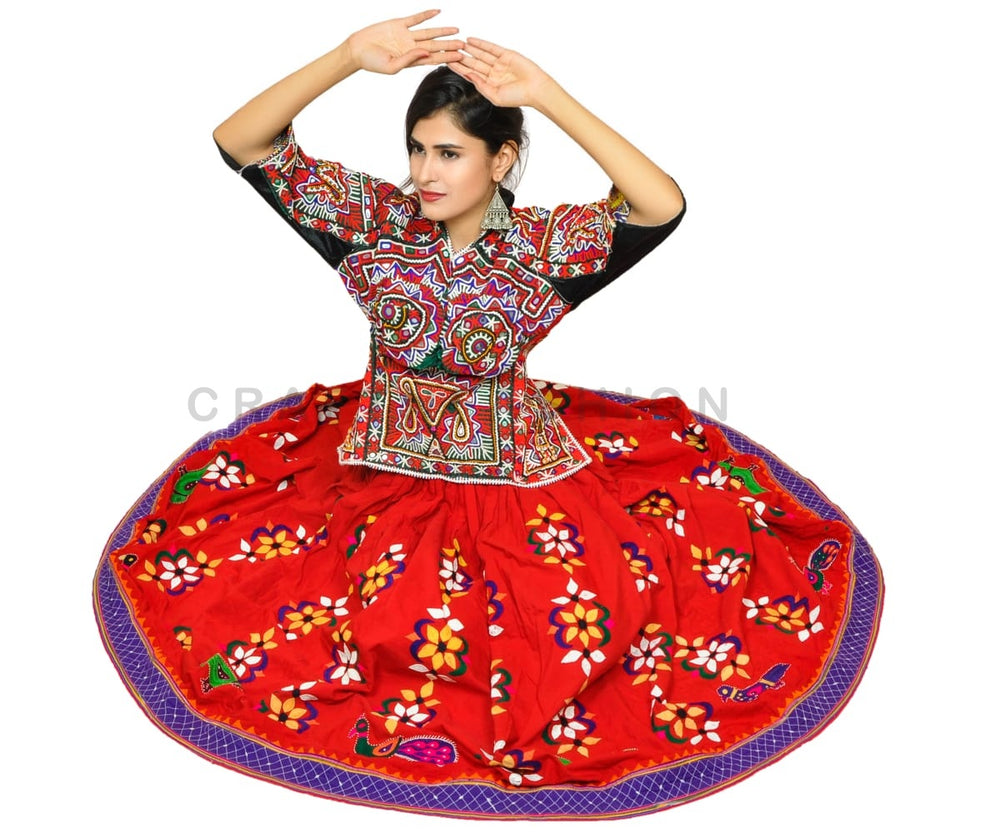 Indian Traditional Gujarati Hand Embroidered Kutch Skirt, Lehenga ,Ghagra with Birds and Flowers motifs.