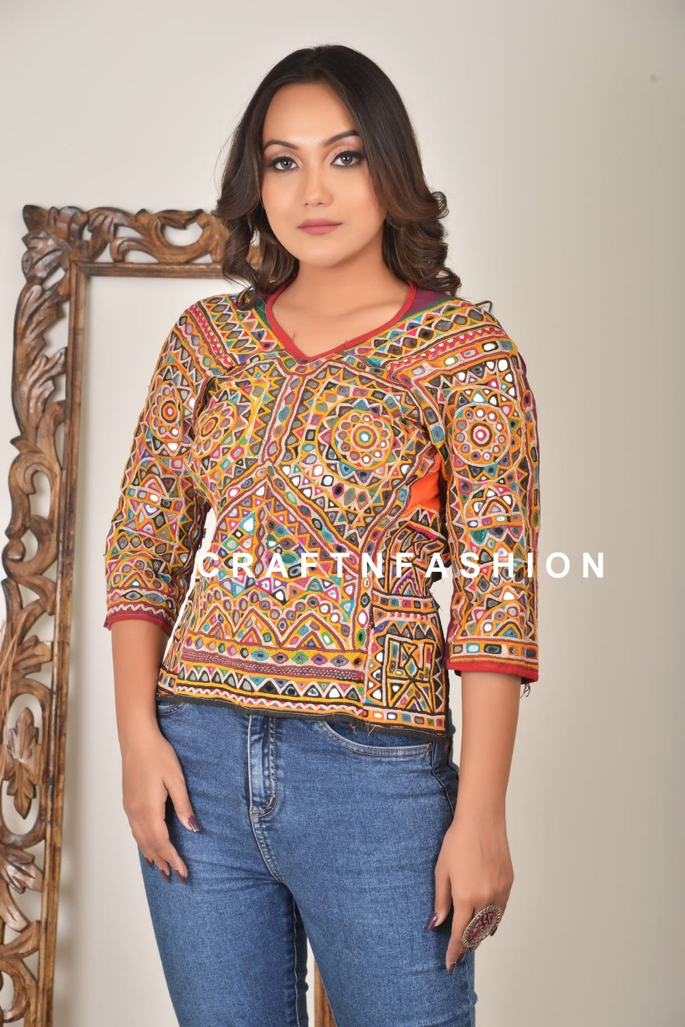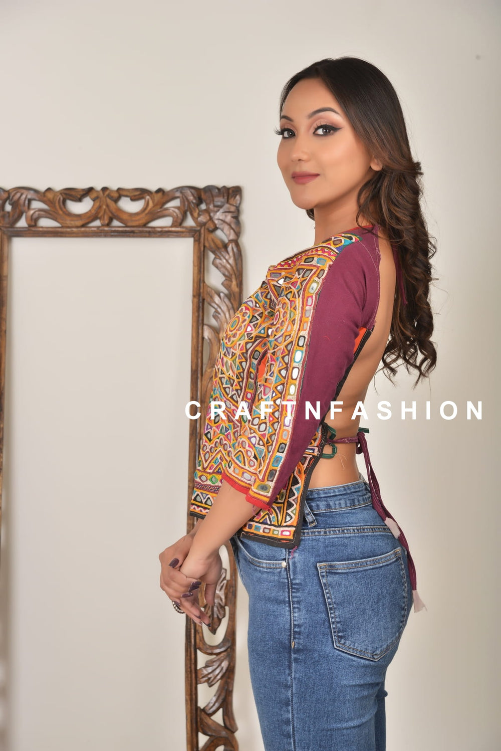 Embroidery Backless Kapda Blouse Indian Vintage Hand Crafted Tribal work Blouse Embellished with Hand embroidery & Mirror Work. This is collectible well preserved vintage Embroidered Backless blouse.