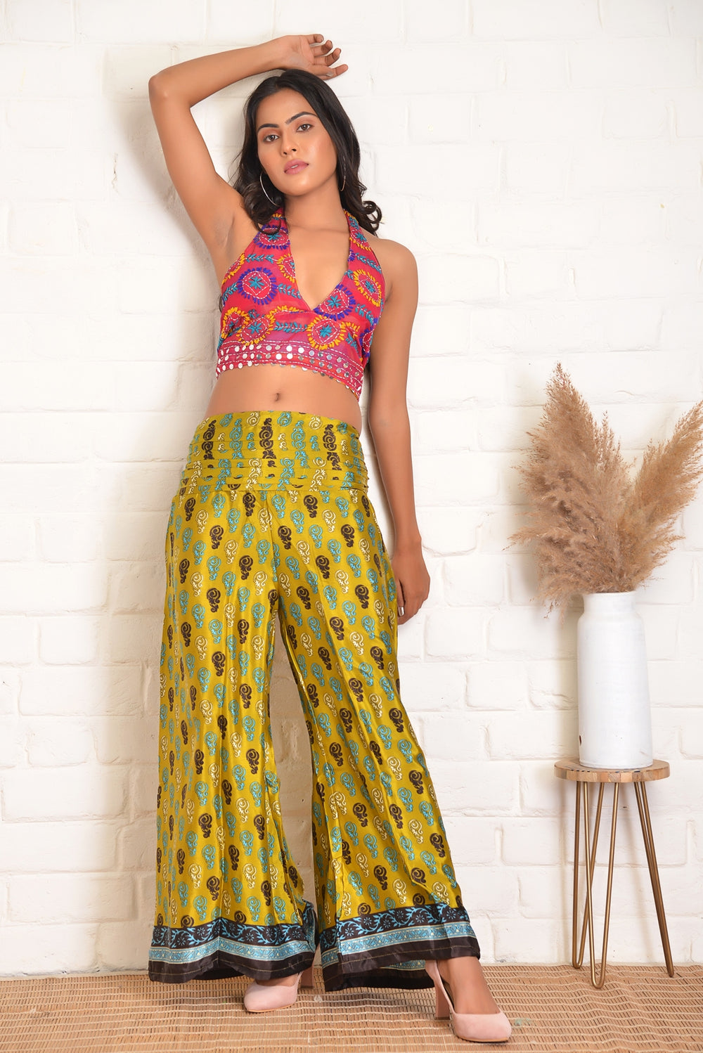 Indian Vintage Recycled Silk Wide leg Trouser Palazzo Pant with Front Side Pleats & Backside smocked Waist Free Size.
