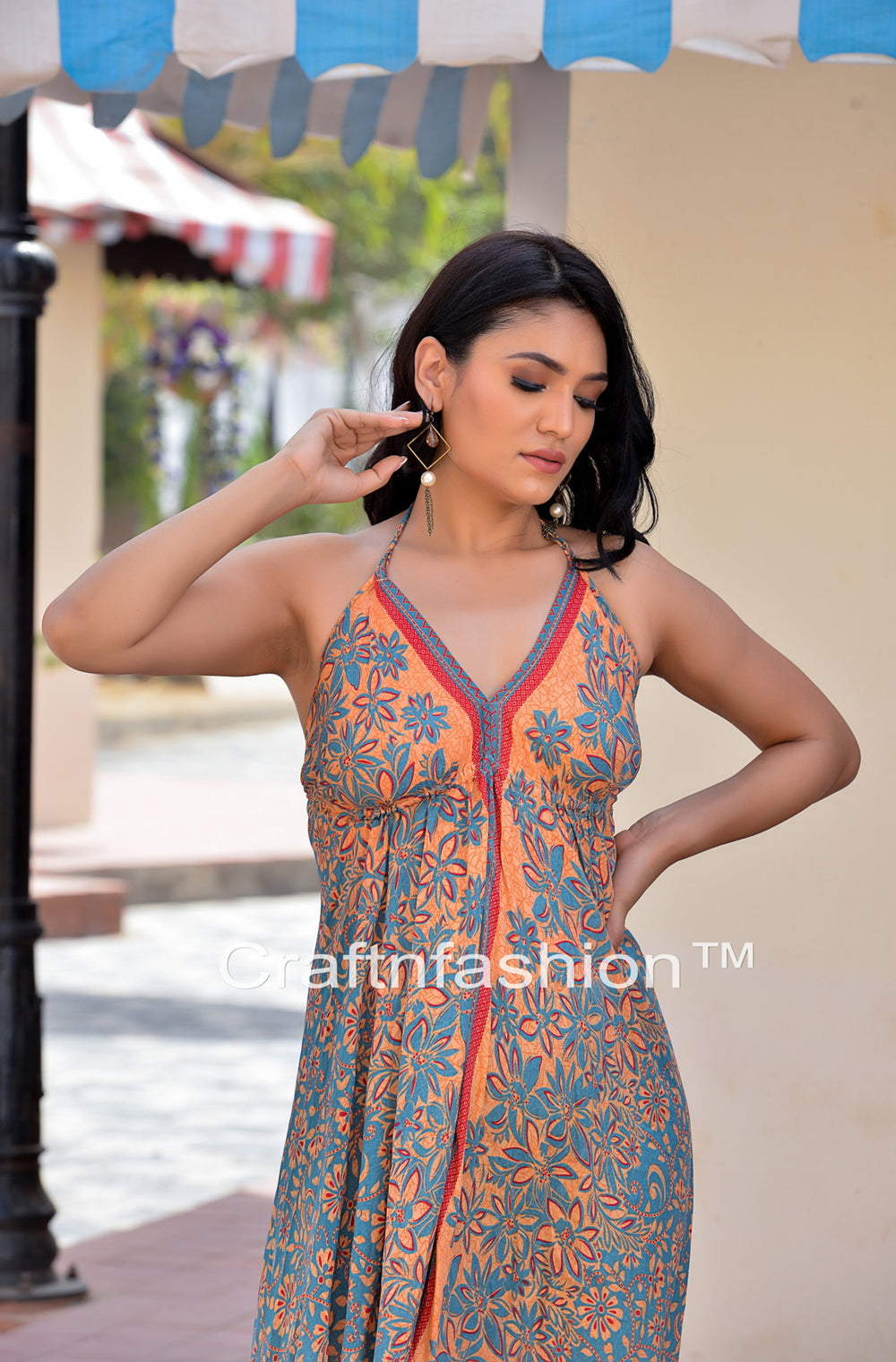 Designer Exclusive Indian Recycled Silk Sari made Boho Beach Party Wear Halter Neck Maxi Dress will enhance your beauty.