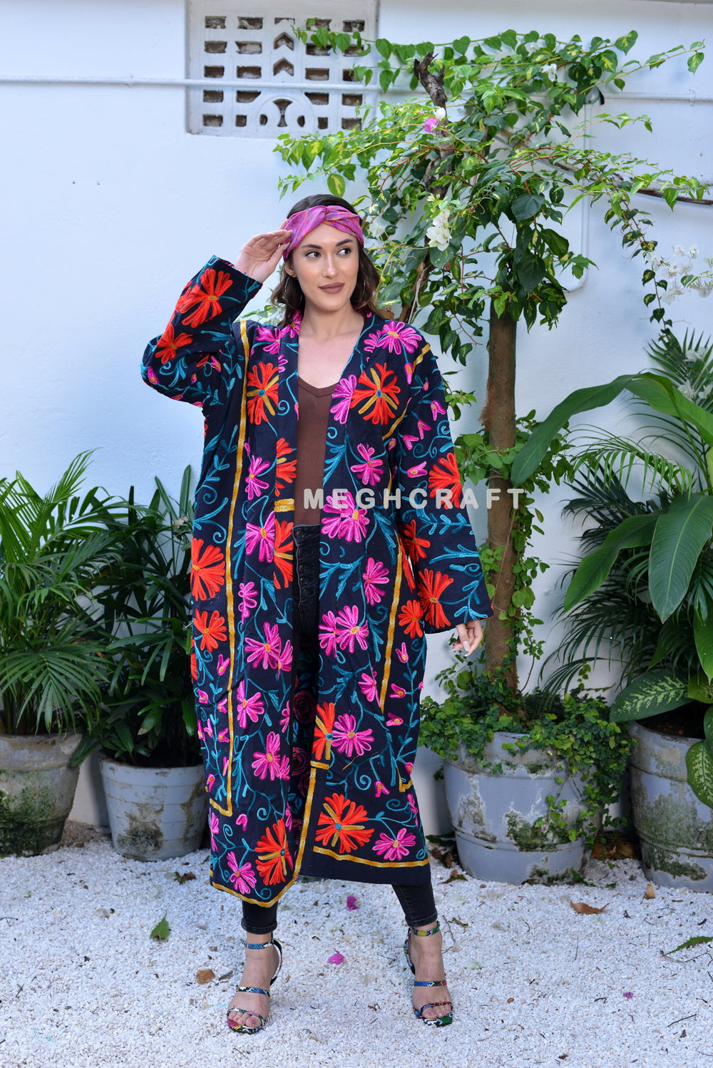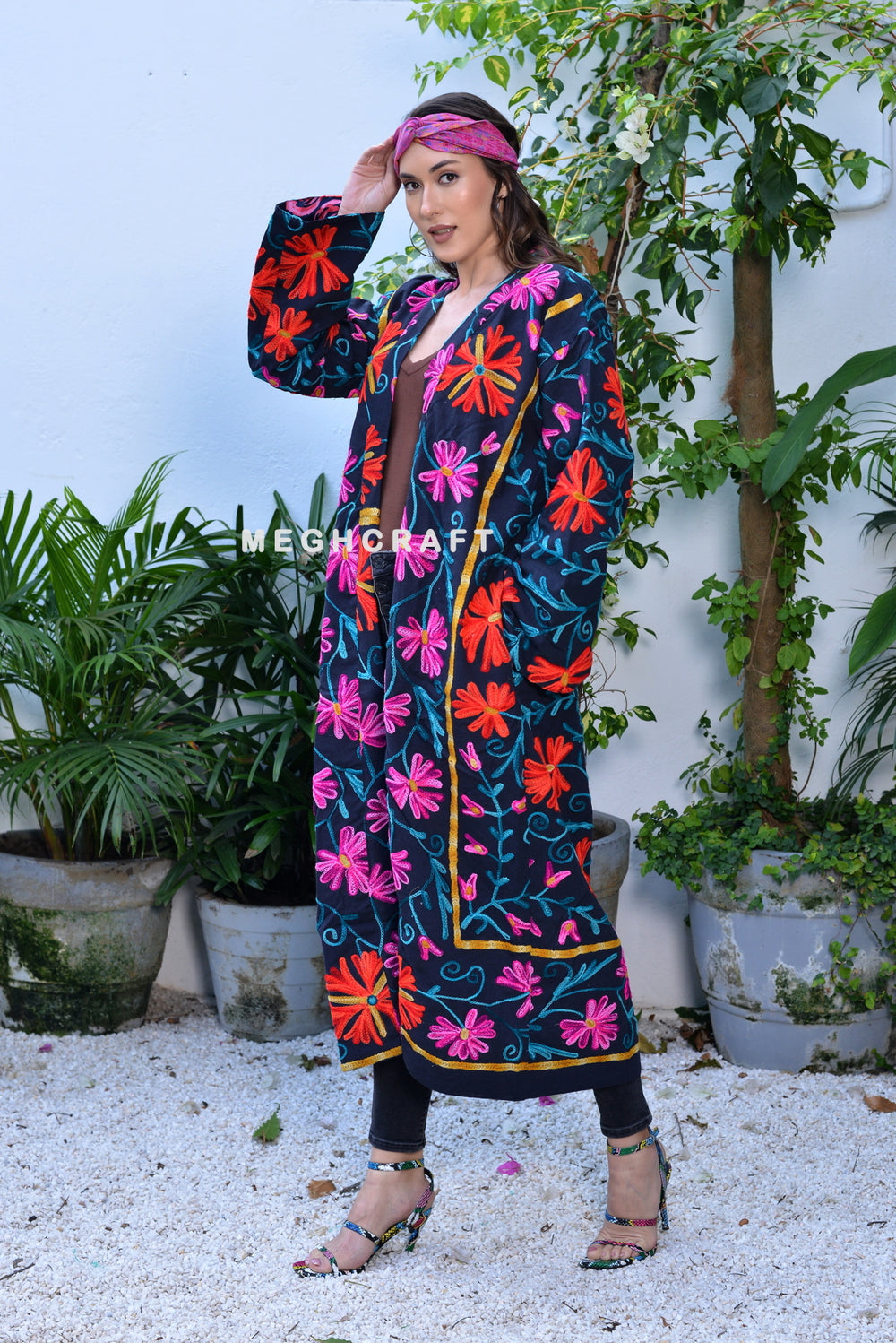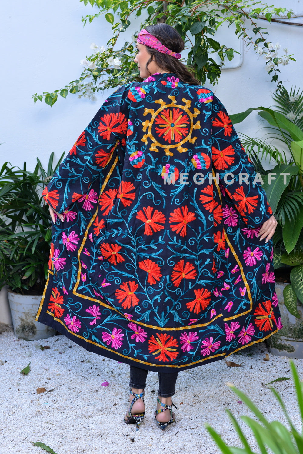 Indian Cotton Handmade Suzani Embroidered Long Kimono Jacket.