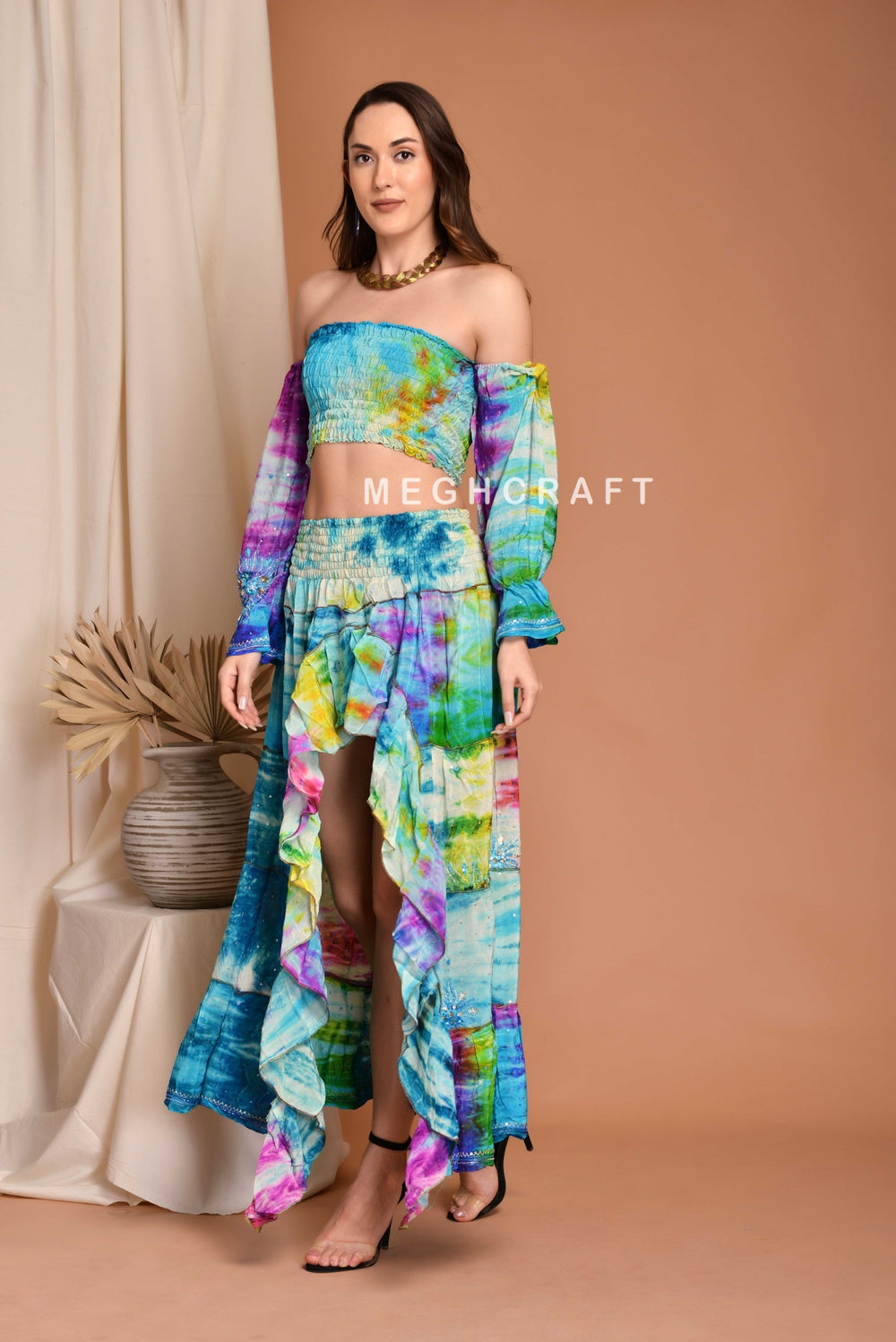 Designer Latest New High Low Tie Dye Skirt and Smocked Top Set.