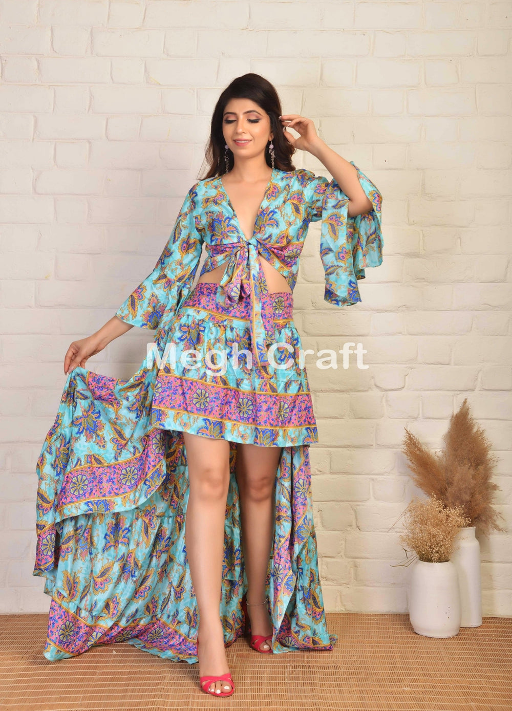 Latest Designer Summer fashion Boho Fashion High Low Smocked Waist Skirt with Tie Style Top / Blouse.