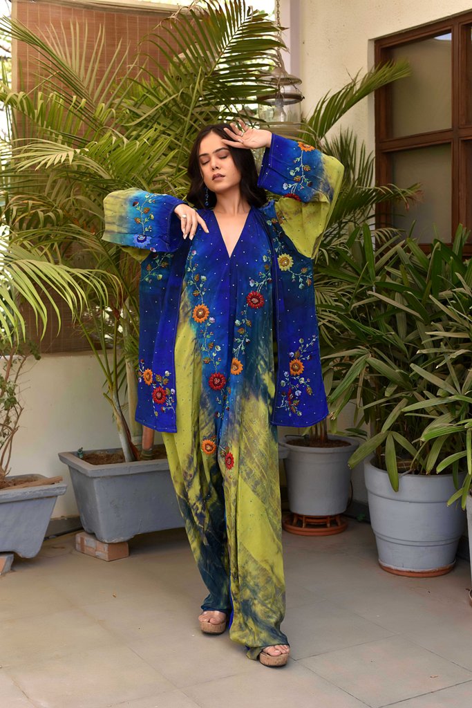 An Exclusive TIE DYE color combination of Crepe Silk, embellished with sequence hand embroidery and bead work.
