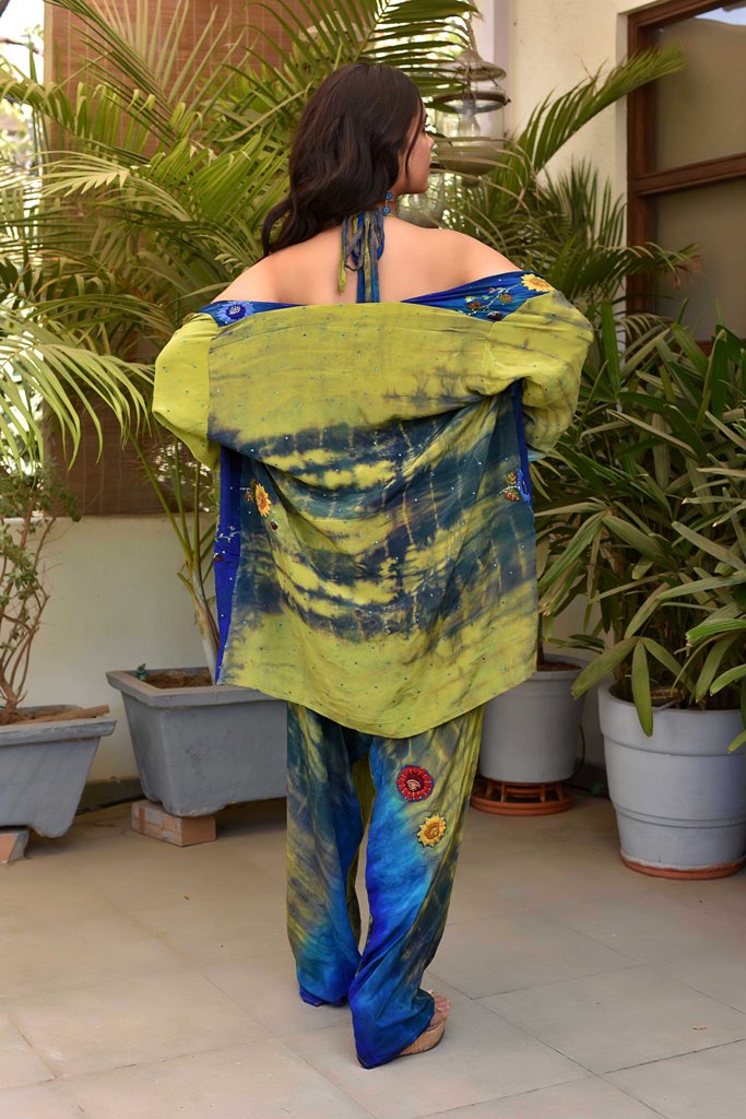Designer Exclusive Tie Dye Vintage Embellished Sequin Handmade Boho Party Wear Magic Set of Halter Neck Jumpsuit with Matching Short Kimono, completely original and one of a kind Dress.