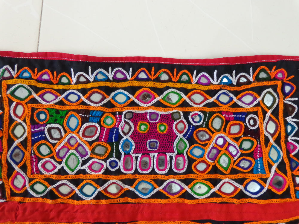 This Antique Banjara Gypsy bohemian or "Indian vintage” sturdy cotton hand embroidered toran (Door hanging) from Kutch Gujarat. The interplay of geometric forms with vibrant colors in a simple, unpretentious. A "Tribal" design is classic style which effective in conveying the adoration that went into it's creation. It is designed to hang above a door or window, however, it would be equally suitable as a footer on the end of a bed or one the back of a sofa or as a table runner. Heck, wrap it around your body and wear it as retro-ethnic.Created by the skilled tribal woman of Gujarat