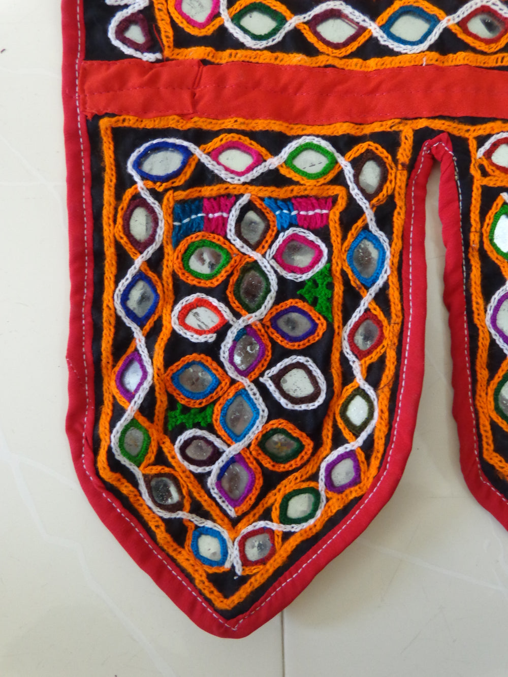 Vintage condition- Original sketch or print mark will show in some places. Some of the material on the flags have frayed or worn. This is an old toran (door hanging) and made by 1960's tribal people so do not expect perfect condition.There is some wear and there are a few stains at the two ends but indeed they do nothing to diminish its beauty.There is some dirt and wear,some small holes from Vintage Material. Some of the mirrors are cracked/burned or are missing. It isn't evident unless you are looking for it; the busy design more than blinds your eye to it.