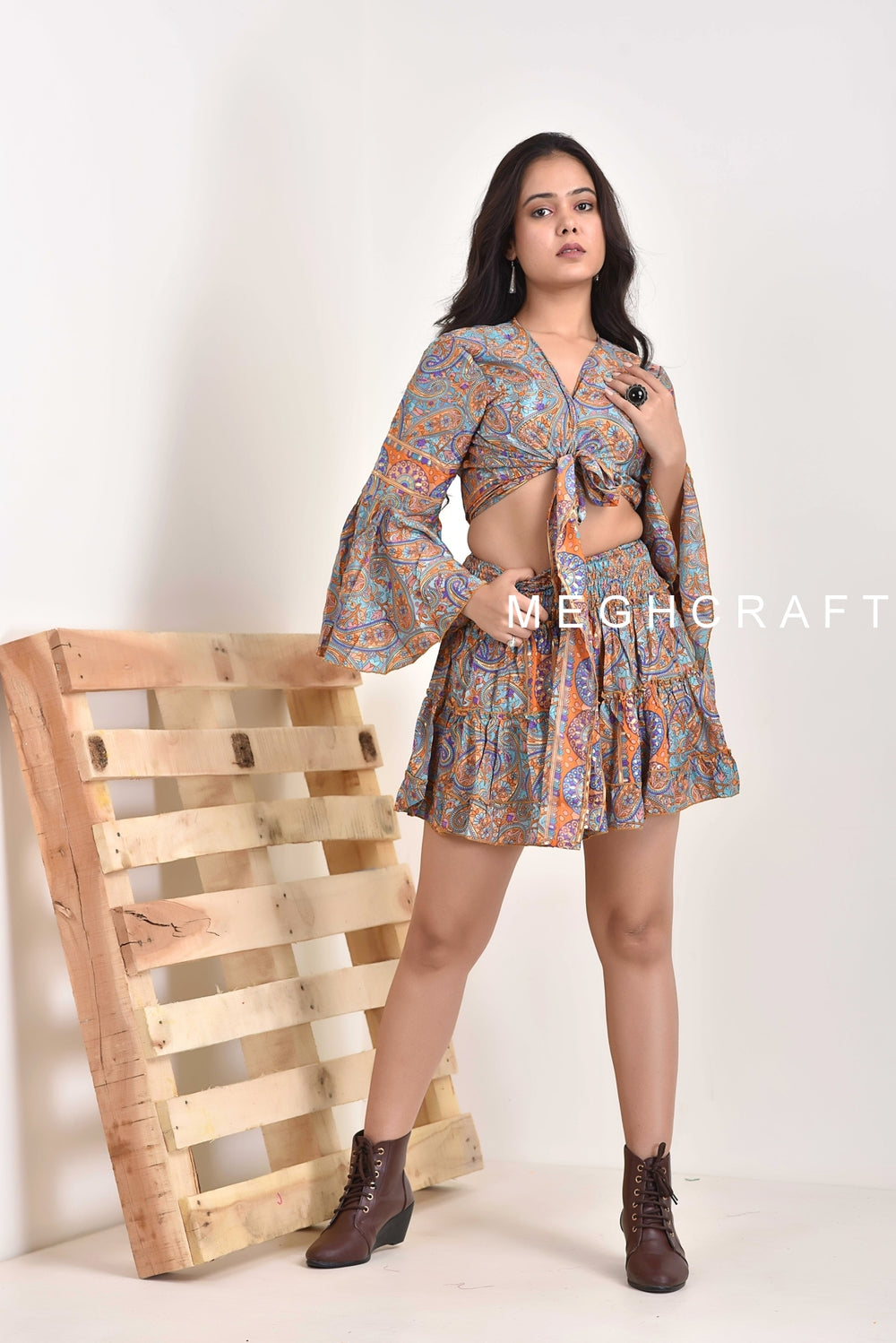 Latest Designer Boho Fashion Silk Free Size Bell Sleeve Tie top with Mini Skirt