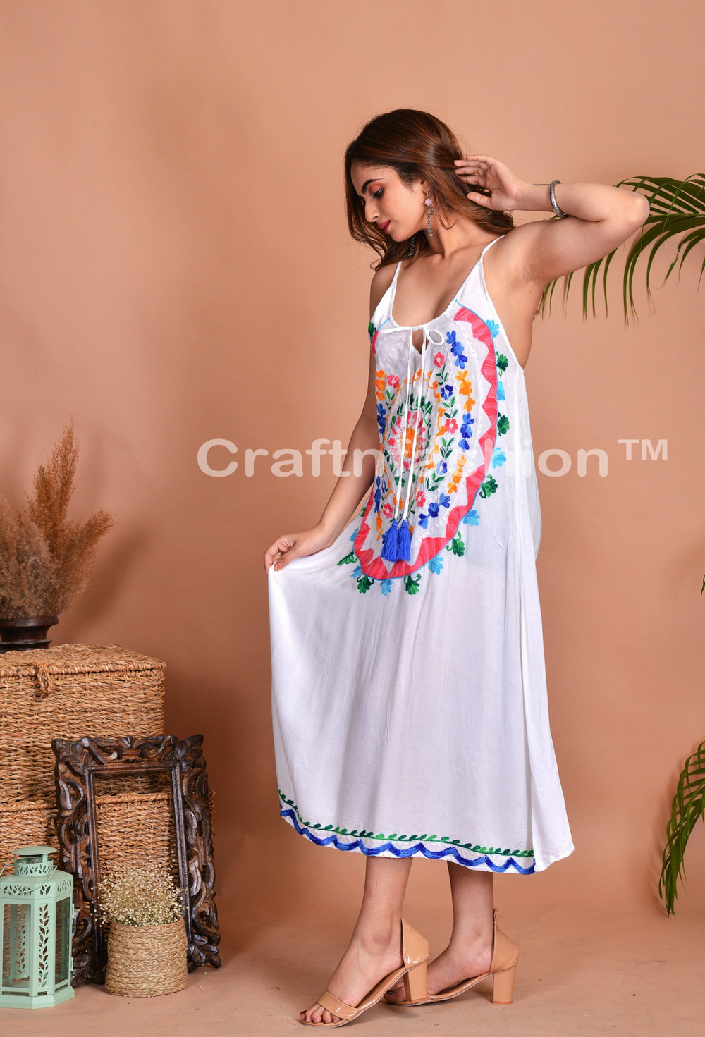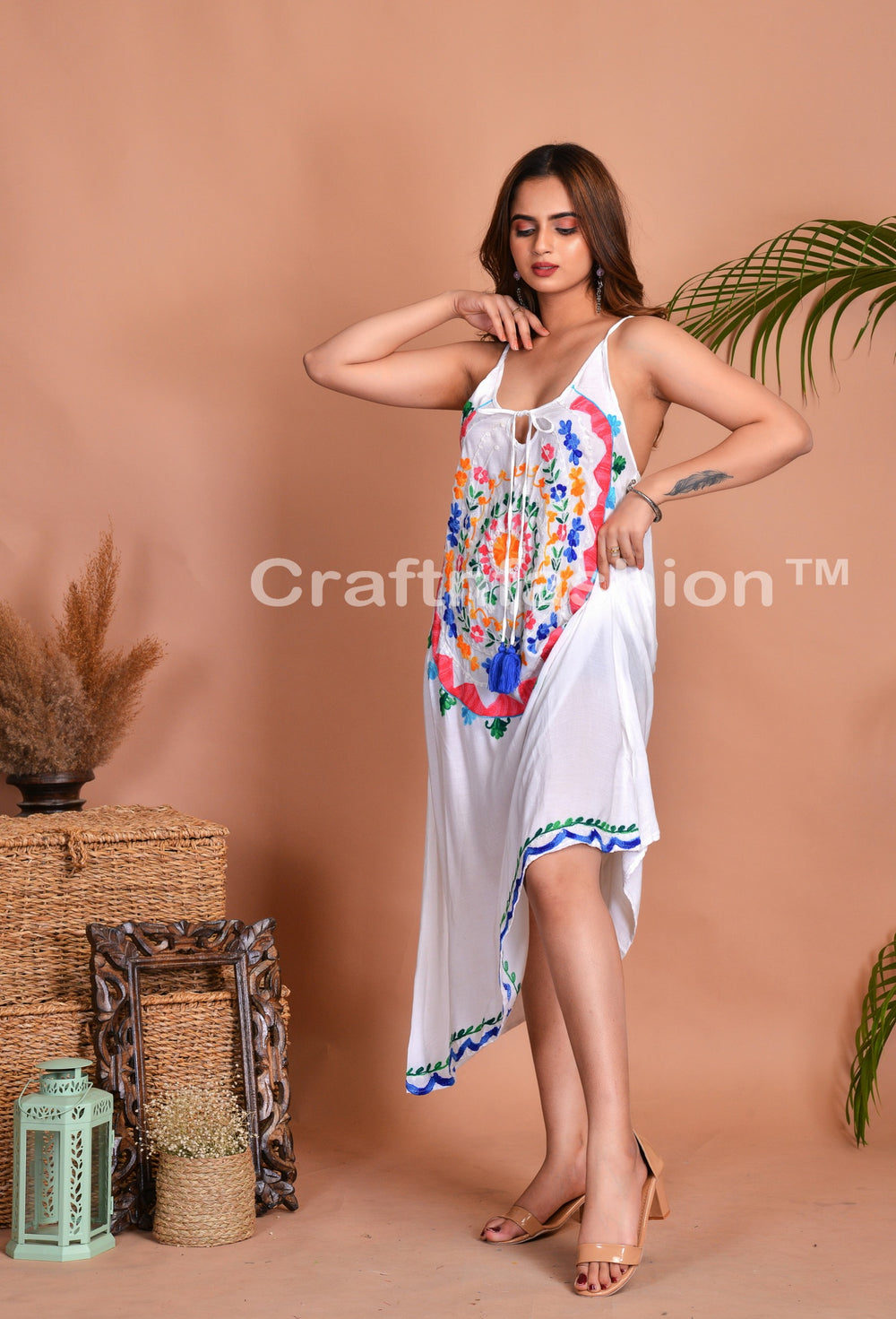 Beach Wear Embroidered Midi Dress, Designer Mandala Embroidery Work Spaghetti style Midi Dress.