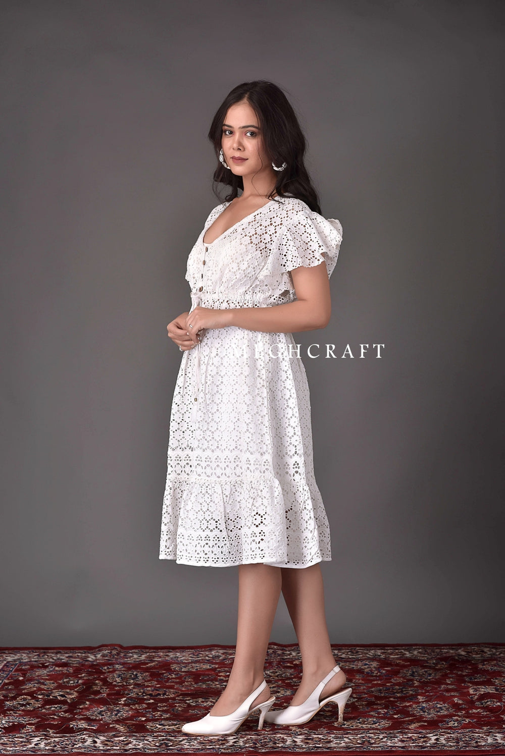 Designer Schiffli Embroidered Cutwork Midi Dress. Best Suitable for summer wear ,beach wear ,wedding wear, bridesmaid's dresses & fashion wear.