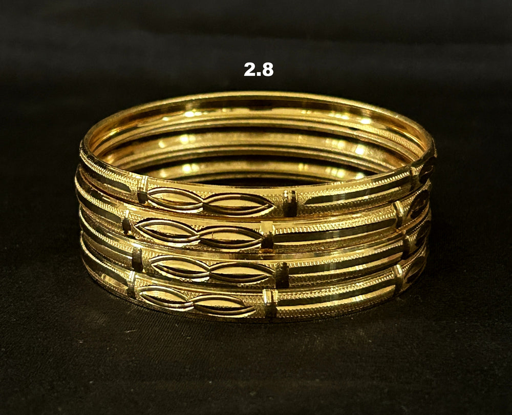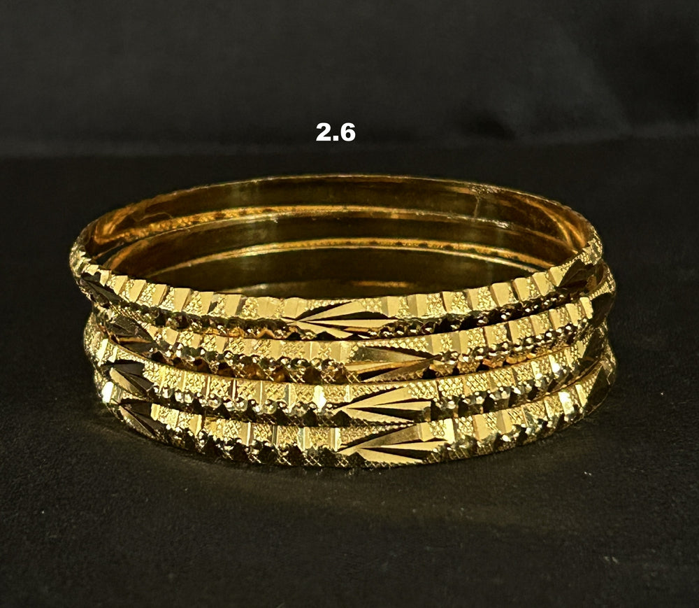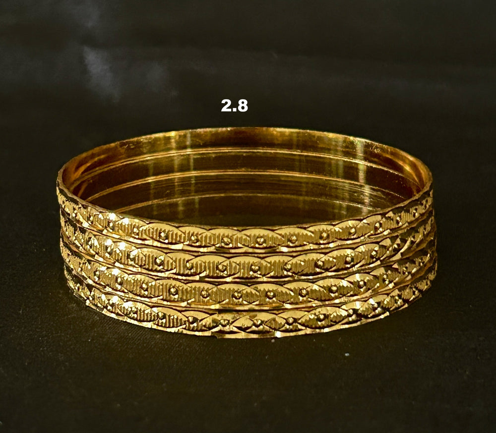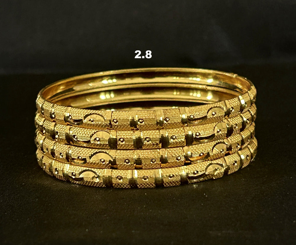Wholesale Indian Traditional Gold plated Bangle Set of 4pcs . Last stock of 16sets of Bangles as per image. Please refer attached image for designs & size reference.