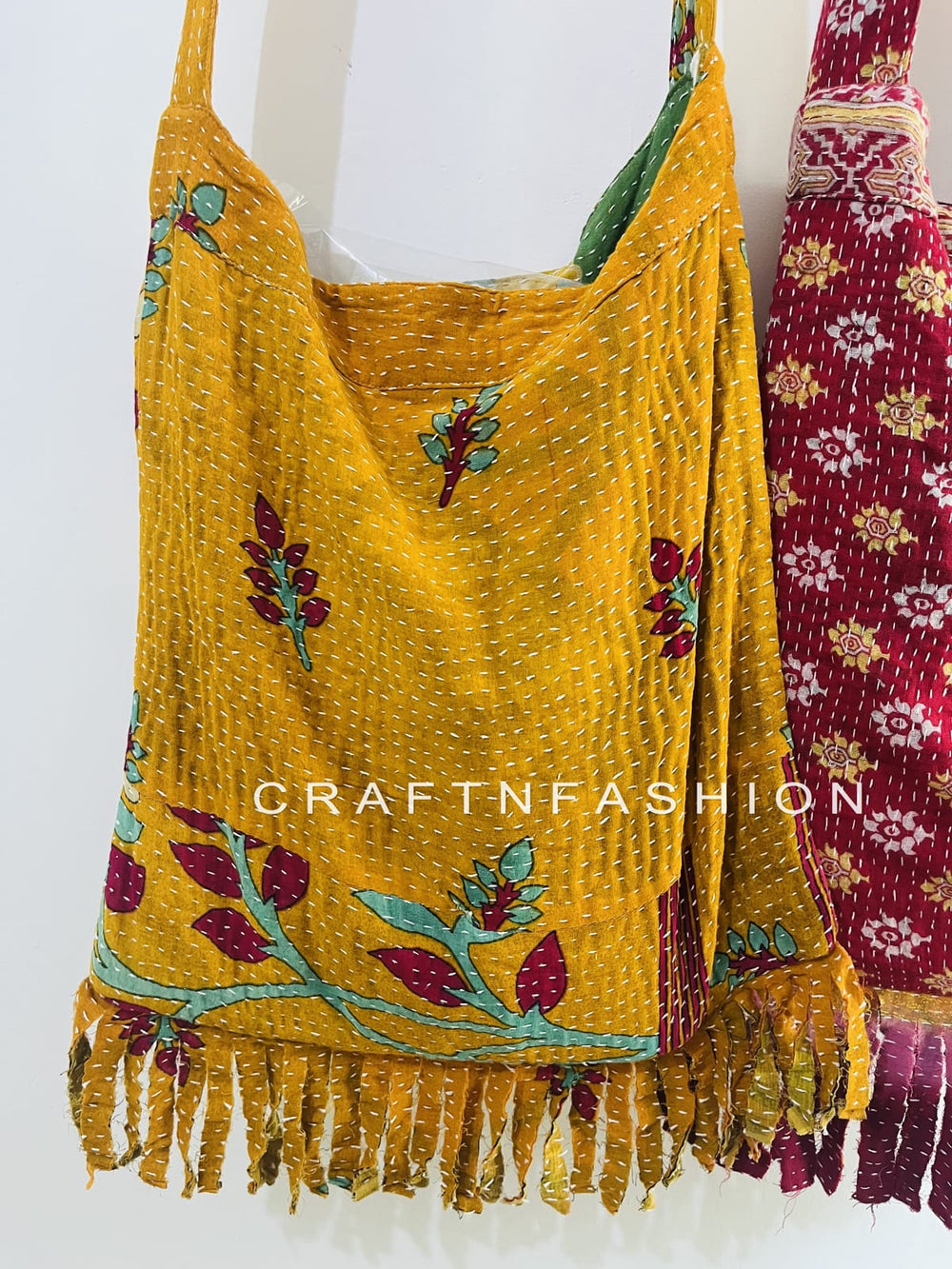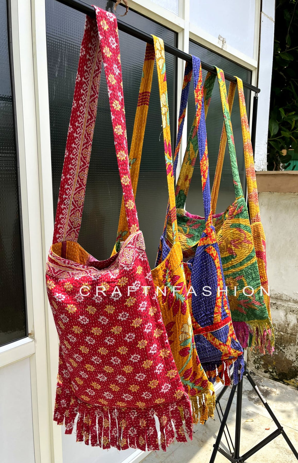 Wholesale Assorted Indian Handmade Embroidered Fringe Style Kantha Jhola Bag , Kantha Shoulder Bag, Kantha Long Strap Bag.