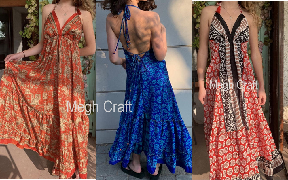 Designer Exclusive Indian Recycled Silk Sari made Boho Beach Party Wear Halter Neck Maxi Dress will enhance your beauty.