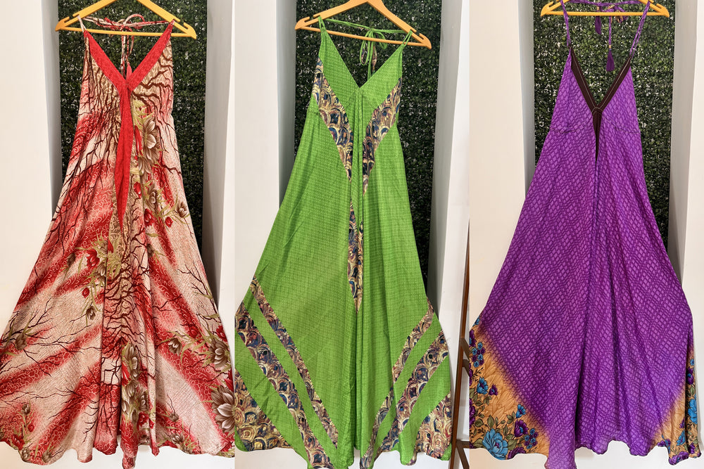 Designer Exclusive Indian Recycled Silk Sari made Boho Beach Party Wear Halter Neck Maxi Dress will enhance your beauty.