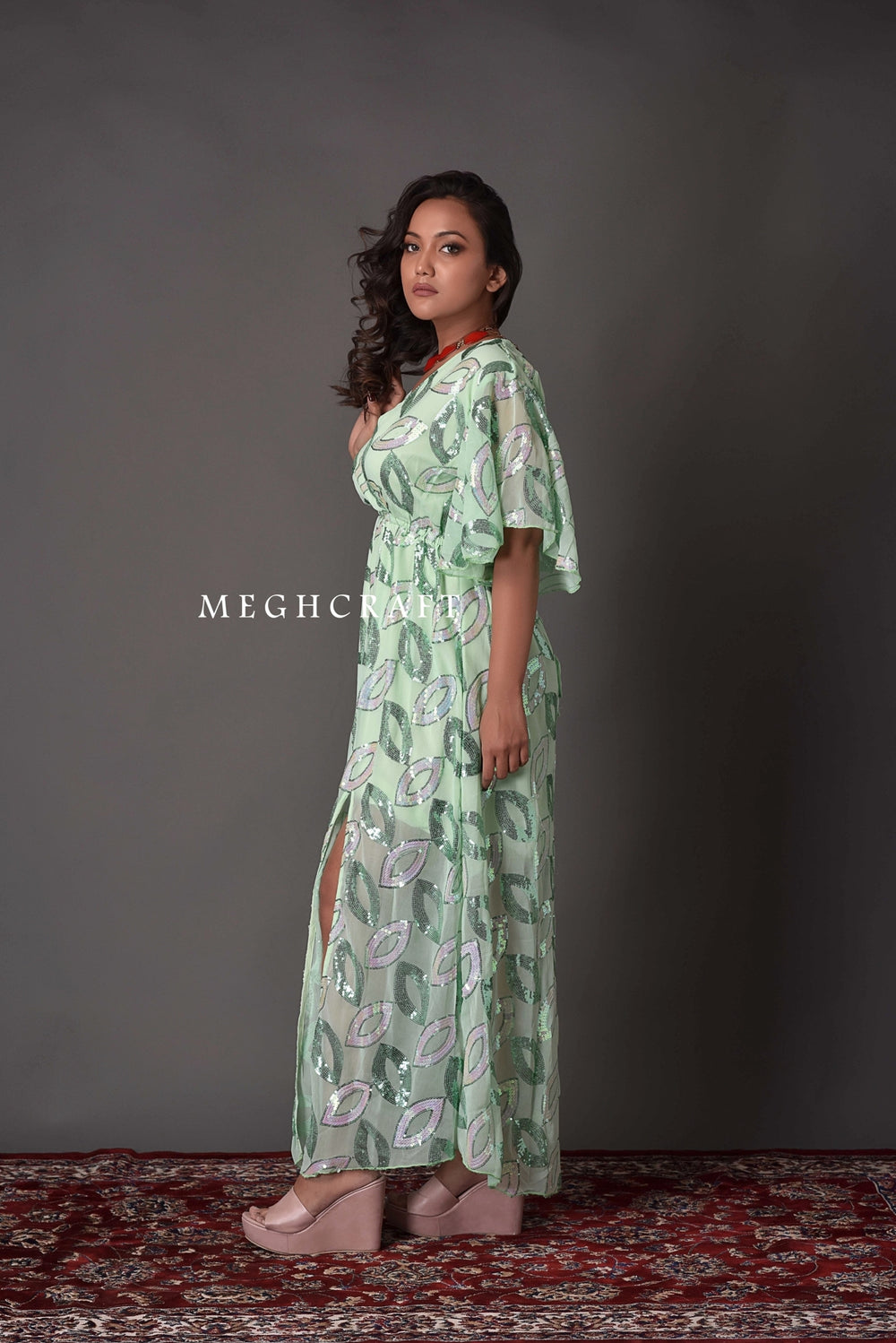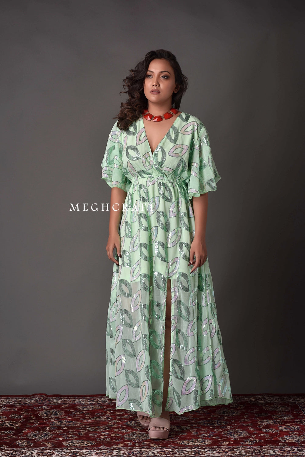 Designer Chiffon Sequin Embroidered V - Neck Maxi Dress. Best Suitable for Beach party wear , Cocktail Party, Evening wear , Club wear , Party wear & More.