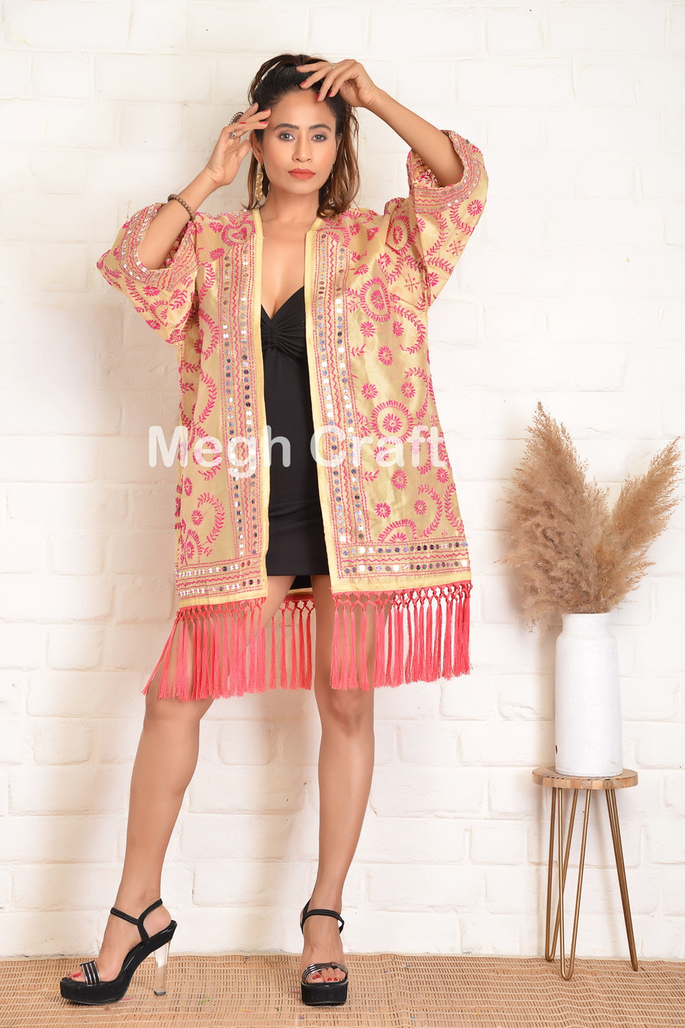 Designer Women Fringe Short Kimono. Indian Chanderi Silk Phulkari Hand work Boho Fashion Fringe Short Kimono Robe. Embroidered Boho Style Beach wear Body Cover Up. Fringe Kimono. Best Suitable For Beach Wear, Fusion Wear, Fashion Wear, Traditional Wear